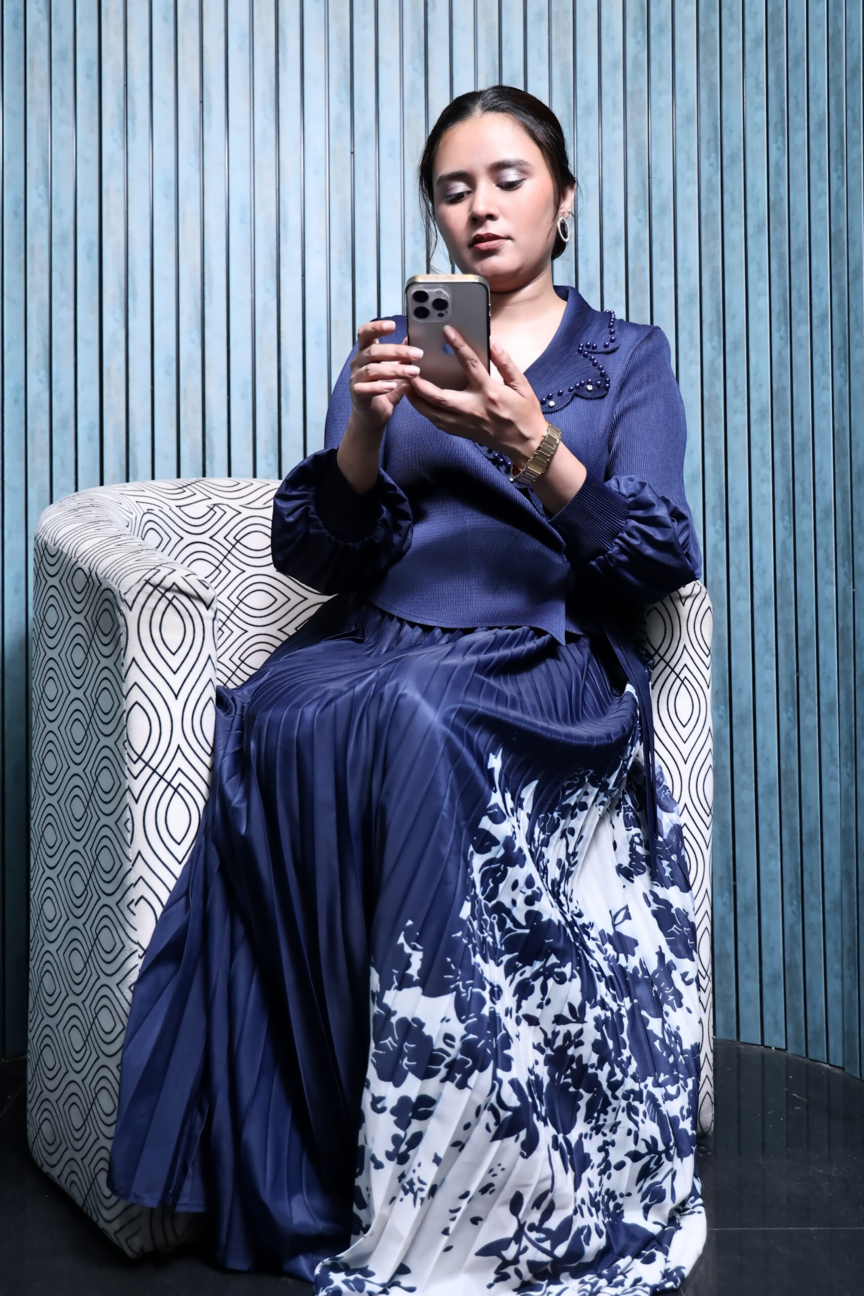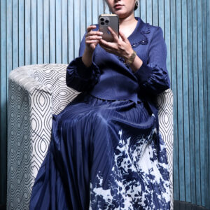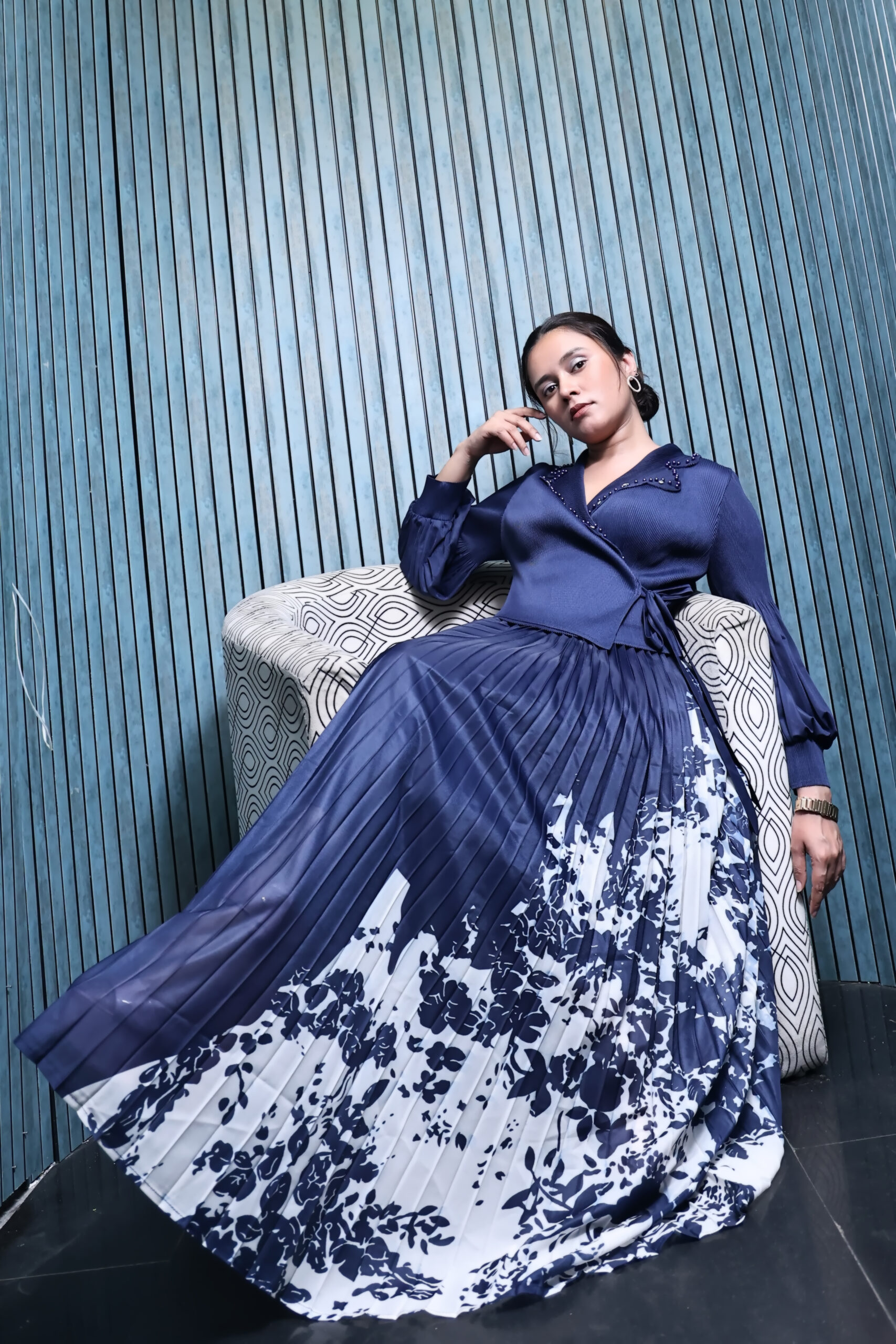 It’s perfectly paired with a high-waisted, pleated flowy skirt featuring a dreamy floral design cascading at the hem. The mix of deep blue and crisp white offers a stunning visual balance — ideal for formal evenings, office meets, or classy dinner affairs.